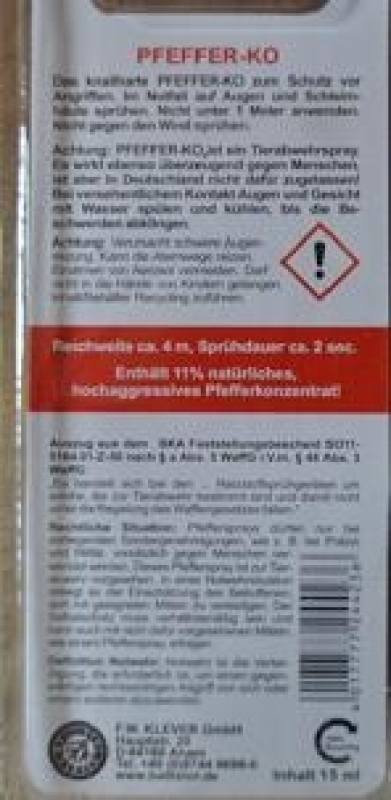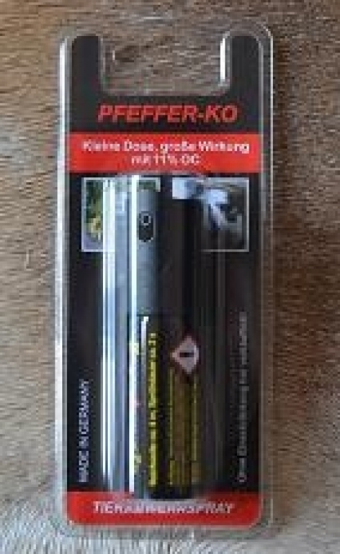 Das hochwirksame Abwehrspray auf Pfefferbasis enthält 11 % konzentrierten Extrakt Oleodresin Capsicum, und der bedeutet auch für den aggressivsten Angreifer den technischen K.O. Bitte beachten: Das Pfefferspray ist ein Tierabwehrspray. Es wirkt ebenso überzeugend gegen Menschen, ist aber in Deutschland nicht dafür zugelassen. Sowohl das Treibmittel (ozonerhaltend) als auch die Wirk- und Lösestoffe sind biologisch abbaubar. Mit neuem, patentierten Panikverschluss.