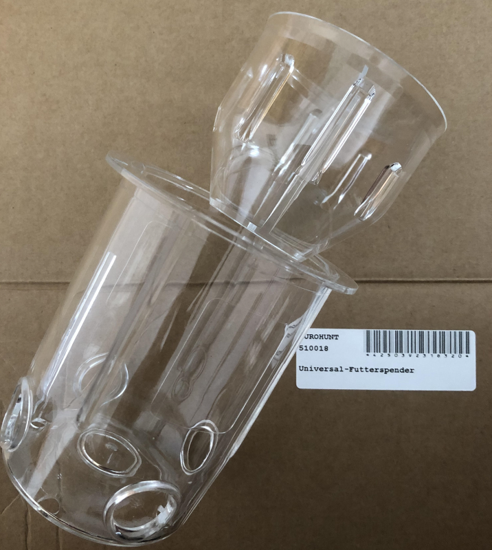 Durch die Transparenz des Futterspenders ist das Futtermittel von außen optimal sichtbar, was eine rasche Annahme der Fütterung gewährt.