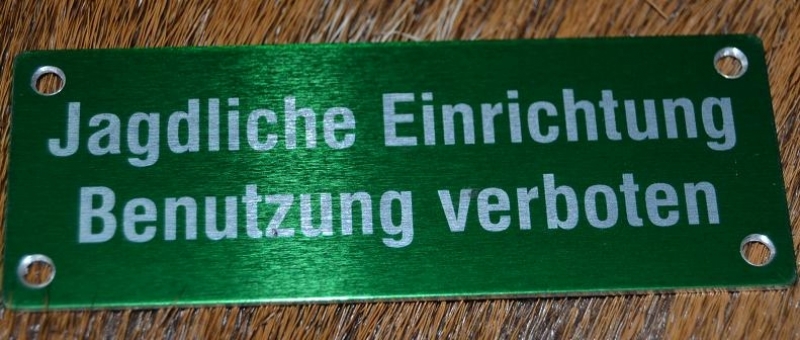 Jagdliche Einrichtung". Alu, wetterbeständig, zum Annageln,Schrauben . Größe ca. 8 x 3cm.