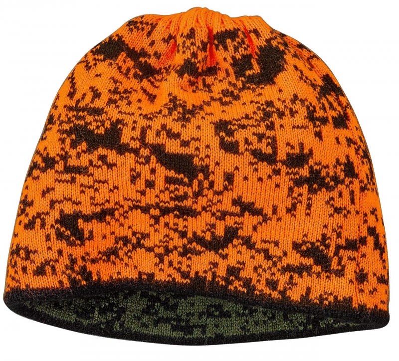 Die Mütze mit optimaler Passform in Pixel-Camo kann in Signalorange oder Olivgrün getragen werden.