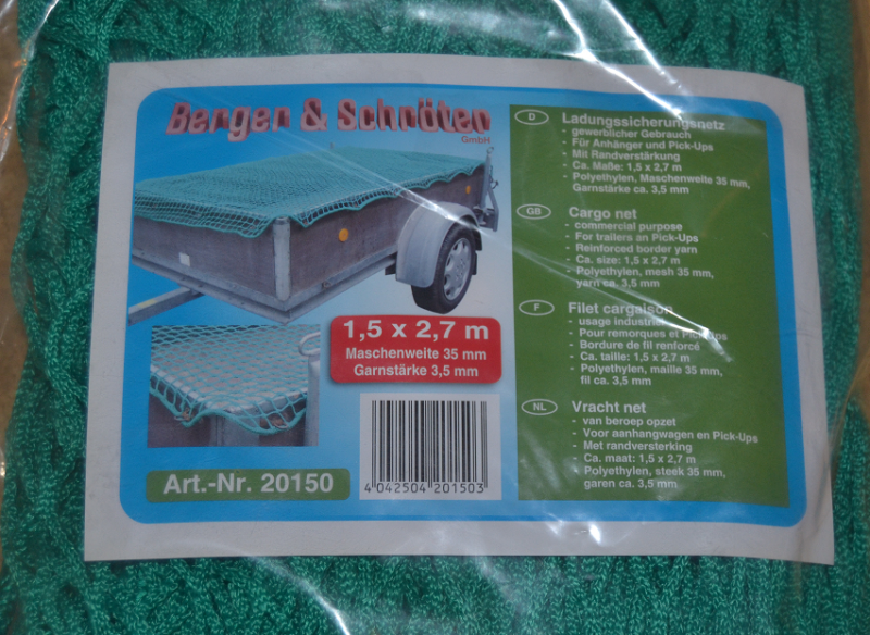 auch für den gewerblichen Einsatz, sichern Sie Ihre Ladung ordnungsgemäß auf Anhänger oder Pick-Up! Maschenweite ca. 35 mm, ca. 3,5mm, Material: Garn 100 % Polyethylen, geflochten, mit umlaufender Randverstärkung. Ca. 1,5 x 2,7 m