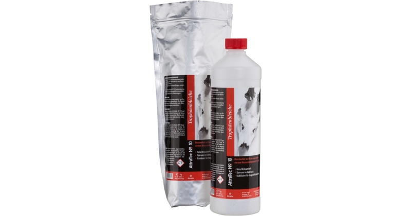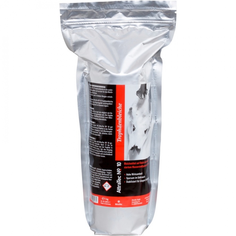AttraTec No 10 ist ein ideales Bleichmittel für Trophäen auf Basis von stabilisiertem Wasserstoffperoxid (11,94%) für verbesserte Haltbarkeit. Es eignet sich sehr gut zum Bleichen von Trophäen. Eine Wichtige Voraussetzung für das Bleichen: Die Trophäe sollte so gut wie möglich von Gewebeteilen und Fett gereinigt sein. Z. B. kann die Zugabe eines flüssigen (Voll)Waschmittels zum Abkochen die Reinigung unterstützen.